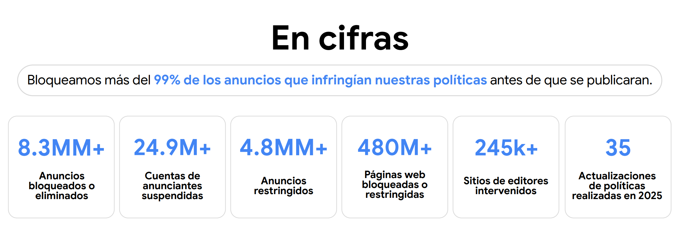 En el balance general, la compañía reporta 24.9 millones de cuentas de anunciantes suspendidas, 4.8 millones de anuncios restringidos, más de 480 millones de páginas web bloqueadas o restringidas y 245 mil sitios de editores intervenidos. A ese cuadro suma 35 actualizaciones de políticas durante el año, lo que muestra una operación de control que combinó automatización, verificación de identidad y ajustes normativos permanentes.
