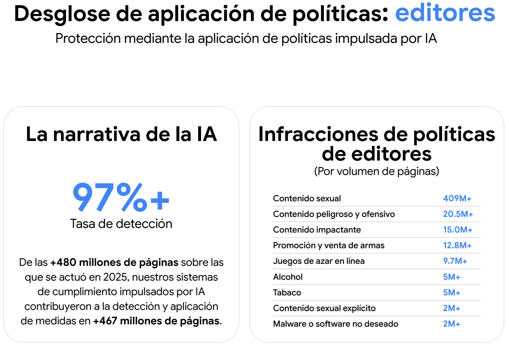 En el frente de editores, Google afirma que actuó sobre más de 480 millones de páginas durante 2025. De ese total, sus sistemas de cumplimiento basados en IA contribuyeron a detectar y aplicar medidas en más de 467 millones de páginas, con una tasa de detección superior al 97%, lo que extiende el peso de la automatización más allá de los anuncios y hacia el inventario editorial donde estos aparecen.