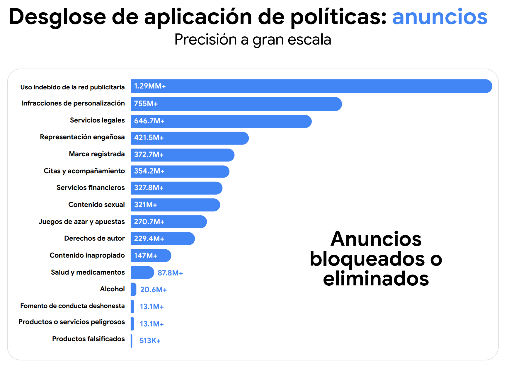 El mayor volumen de medidas sobre anuncios se concentró en uso indebido de la red publicitaria, con más de 1.29 mil millones de casos, seguido por infracciones de personalización con 755 millones, servicios legales con 646.7 millones y representación engañosa con 421.5 millones.