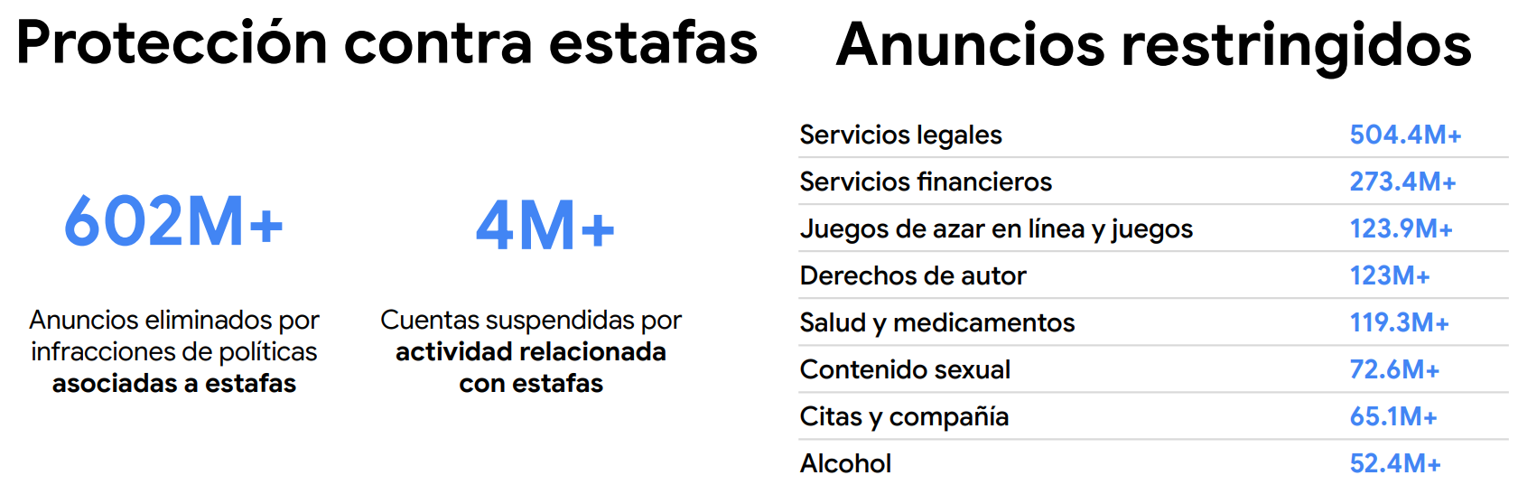 Google informa la eliminación de más de 602 millones de anuncios por infracciones asociadas a estafas y la suspensión de más de 4 millones de cuentas por actividad relacionada con engaños, mientras que en anuncios restringidos los mayores volúmenes se concentraron en servicios legales, servicios financieros, juegos de azar en línea y juegos, derechos de autor y salud y medicamentos.