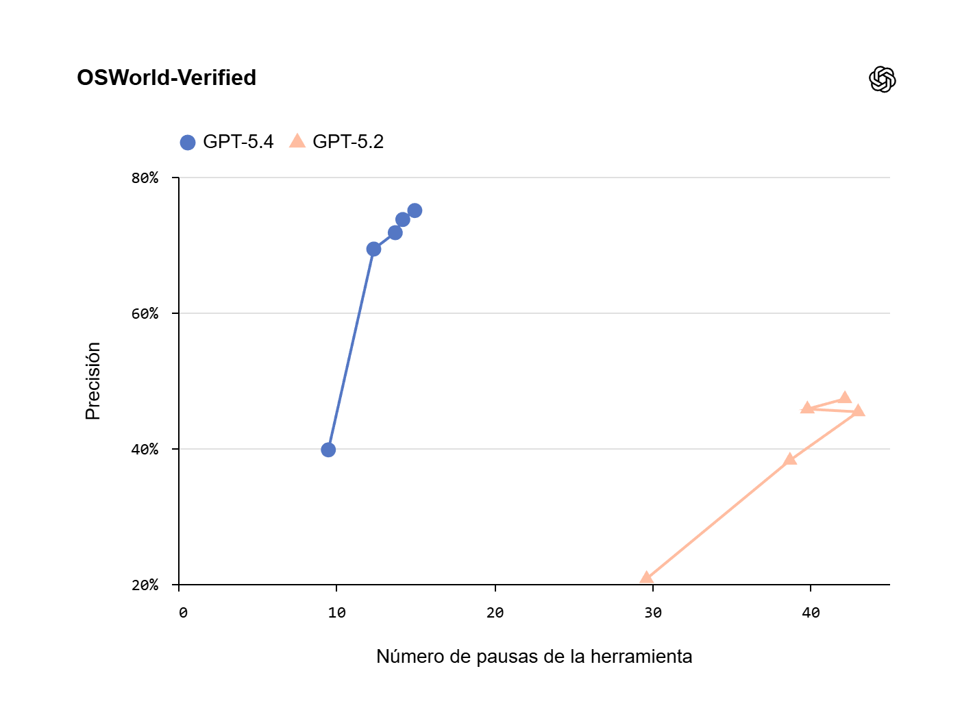 En trabajo profesional especializado, OpenAI indicó que GPT-5.4 igualó o superó a profesionales de la industria en 83,0% de las comparaciones dentro de GDPval, frente a 71,0% de GPT-5.2. En una evaluación interna de modelización en hojas de cálculo obtuvo 87,5%, mientras que GPT-5.2 alcanzó 68,4%.