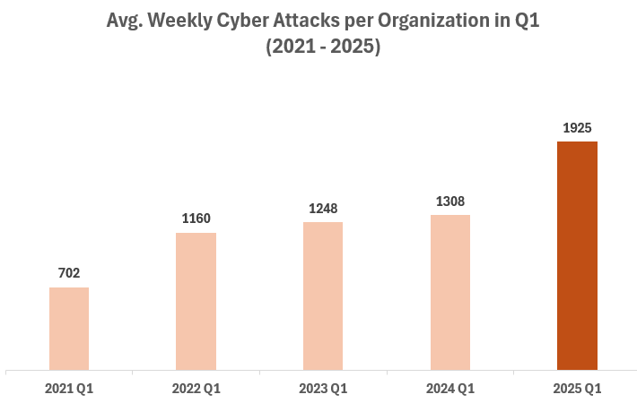 En el primer trimestre de 2025, los ciberataques a nivel mundial experimentaron un fuerte aumento, con empresas que experimentaron ataques más frecuentes y sofisticados. El promedio de ciberataques por organización alcanzó los 1.925 semanales durante enero, febrero y marco de 2025, lo que representa un aumento del 47% en comparación con el mismo período de 2024. A medida que los ciberdelincuentes adaptan y evolucionan sus tácticas, sectores como la educación, los servicios del Estado y las telecomunicaciones se vieron con mayor frecuencia en el punto de mira de estos ataques.