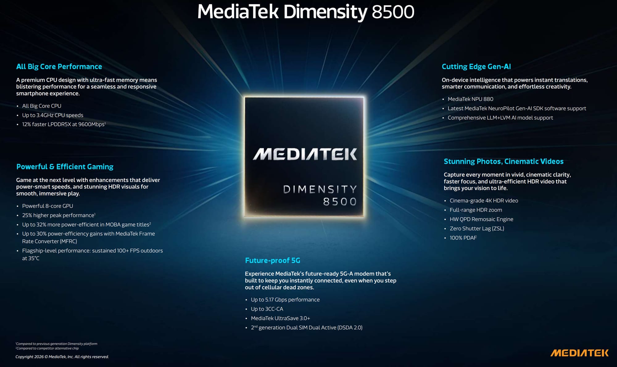 MediaTek presentó oficialmente sus nuevos chipsets Dimensity 9500s y Dimensity 8500 para dispositivos móviles de gama alta. Ambos componentes integran arquitecturas de procesamiento avanzadas que priorizan la potencia bruta y la eficiencia en la ejecución de inteligencia artificial.