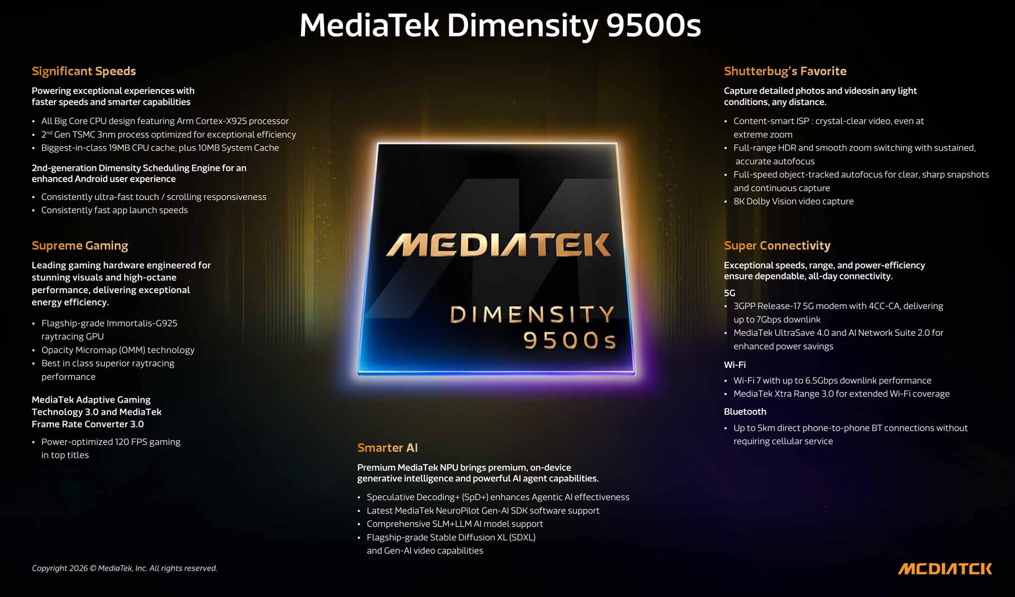 El Dimensity 9500s se fabrica mediante un proceso de 3nm y utiliza una configuración de CPU conocida como "All Big Core". Su estructura interna combina un núcleo ultra Cortex-X925 a 3.73GHz con tres núcleos Cortex-X4 y cuatro unidades Cortex-A720.