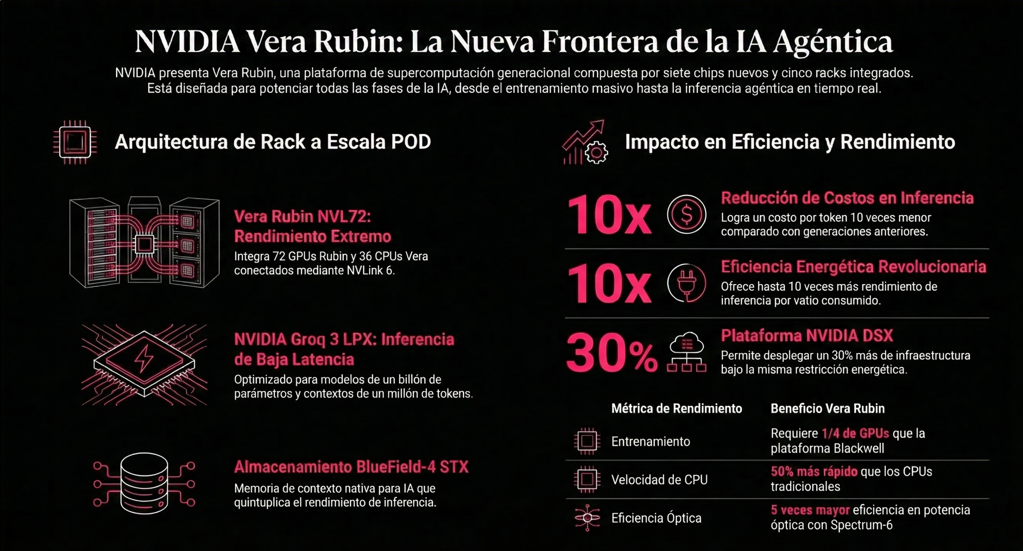 La empresa también afirma que el sistema puede entregar hasta 10 veces más rendimiento de inferencia por watt y reducir el costo por token a una décima parte. A esto se suman un rack Vera CPU para validación y refuerzo, un rack Groq 3 LPX para inferencia de baja latencia y un rack BlueField-4 STX orientado a memoria de contexto.