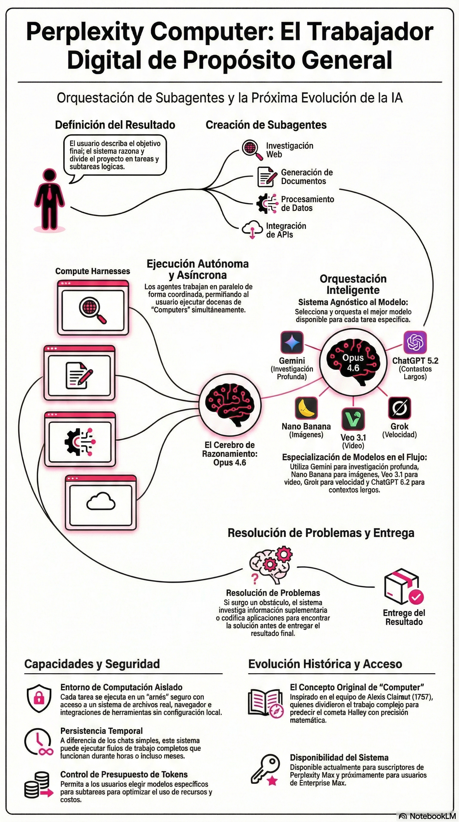 Perplexity Computer funciona como un agente digital de propósito general que interactúa con las mismas interfaces de software que un trabajador humano. Esta arquitectura permite que el sistema razone, delegue tareas, ejecute búsquedas complejas y genere código dentro de un entorno informático aislado.