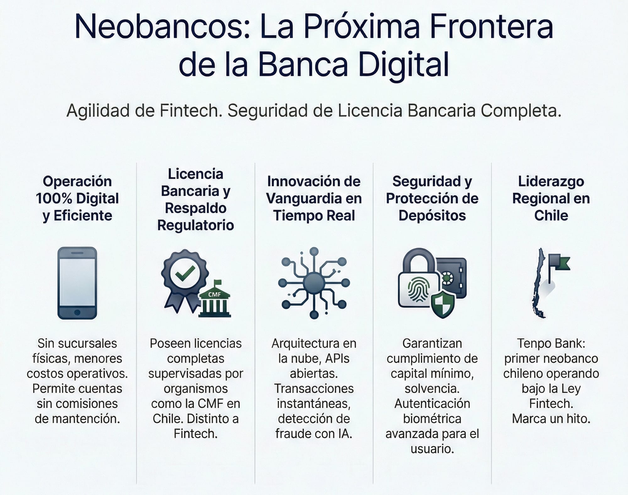- Diferenciación con Fintech: A diferencia de una fintech que actúa como intermediario (prepago o pagos), el neobanco tiene la facultad legal de intermediación financiera completa (créditos y captación).