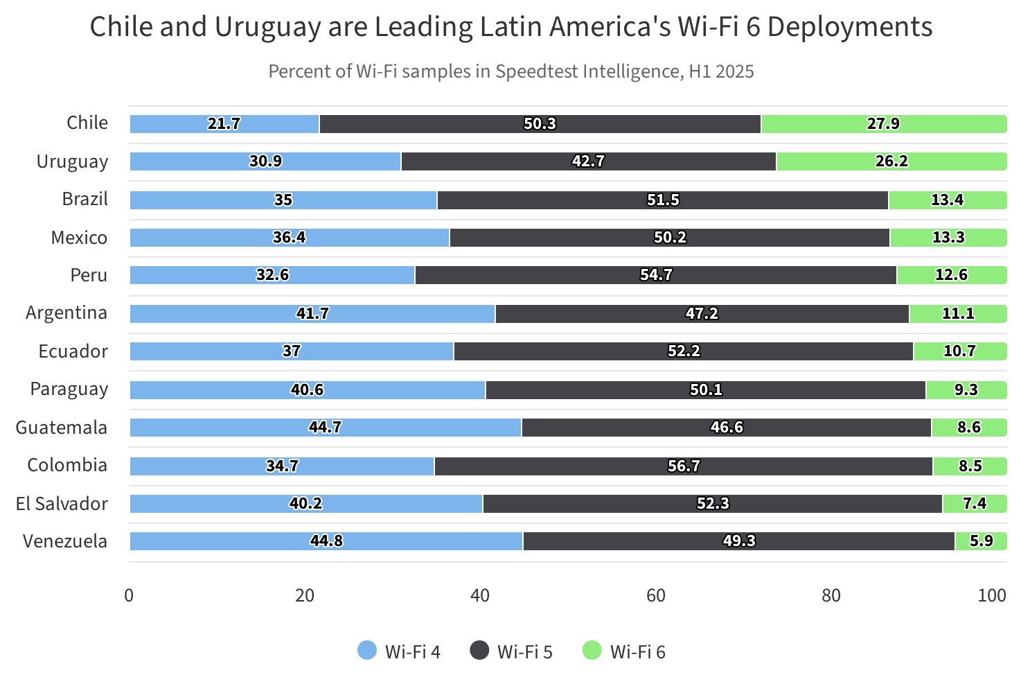- Chile y Uruguay encabezan la adopción de Wi-Fi 6 con más del 25% de las muestras, mientras que países como Argentina, Paraguay y Venezuela aún mantienen proporciones significativas de Wi-Fi 4.
