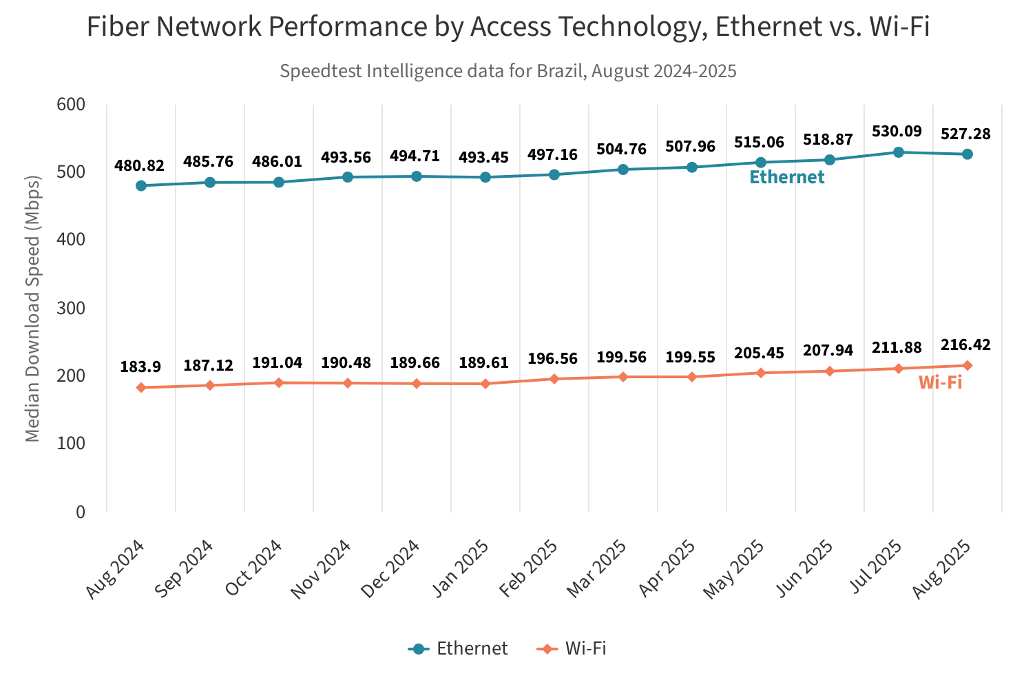 - Las pruebas de Ookla en Brasil muestran que las conexiones por Ethernet (cableadas) duplican en promedio la velocidad de las realizadas vía Wi-Fi, con 530 Mb/s frente a 216 Mb/s.
