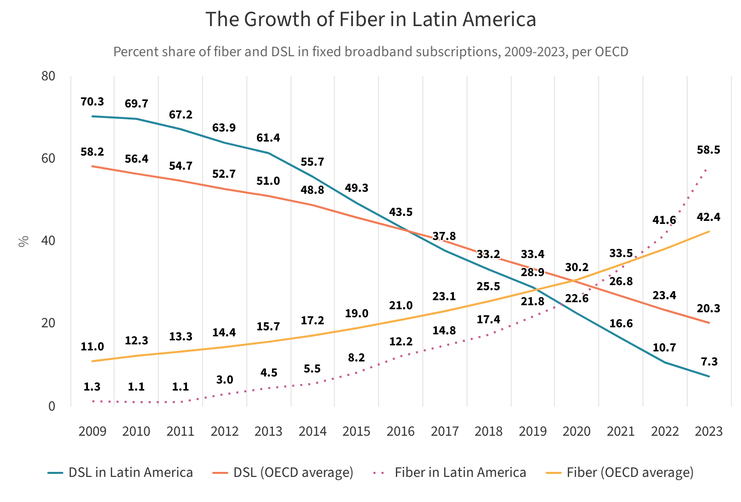 - La participación de la fibra en el total de conexiones fijas en Latinoamérica alcanzó el 42,4% en 2023, mientras el DSL cayó al 7,3%, según datos de la OCDE compilados por Ookla.