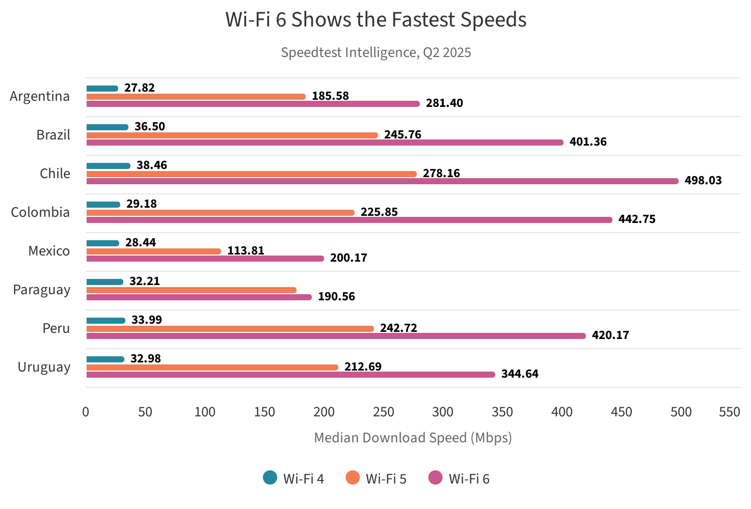 - Operadores como Mundo, WOM y Entel (Chile) o Predialnet y LinQ (Brasil) muestran correlación directa entre mayor uso de Wi-Fi 6 y mayores velocidades medianas.
