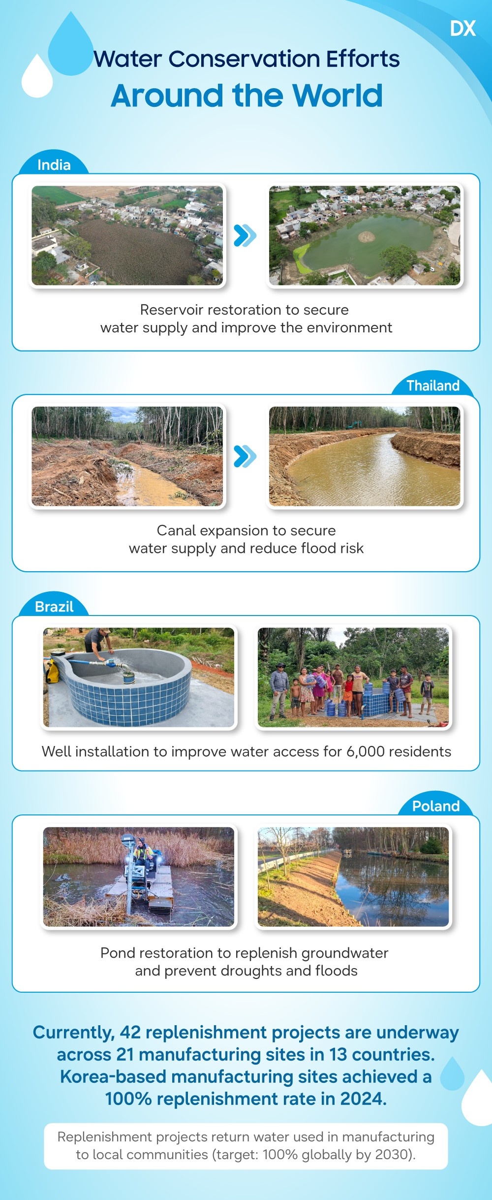 Dentro de las acciones destacadas figuran trabajos de restauración de reservorios en India para asegurar abastecimiento y mejorar el entorno, ampliación de canales en Tailandia para reforzar el suministro y reducir riesgo de inundaciones, instalación de pozos en Brasil para mejorar el acceso al agua de 6.000 residentes y restauración de estanques en Polonia para recargar aguas subterráneas y prevenir sequías e inundaciones.