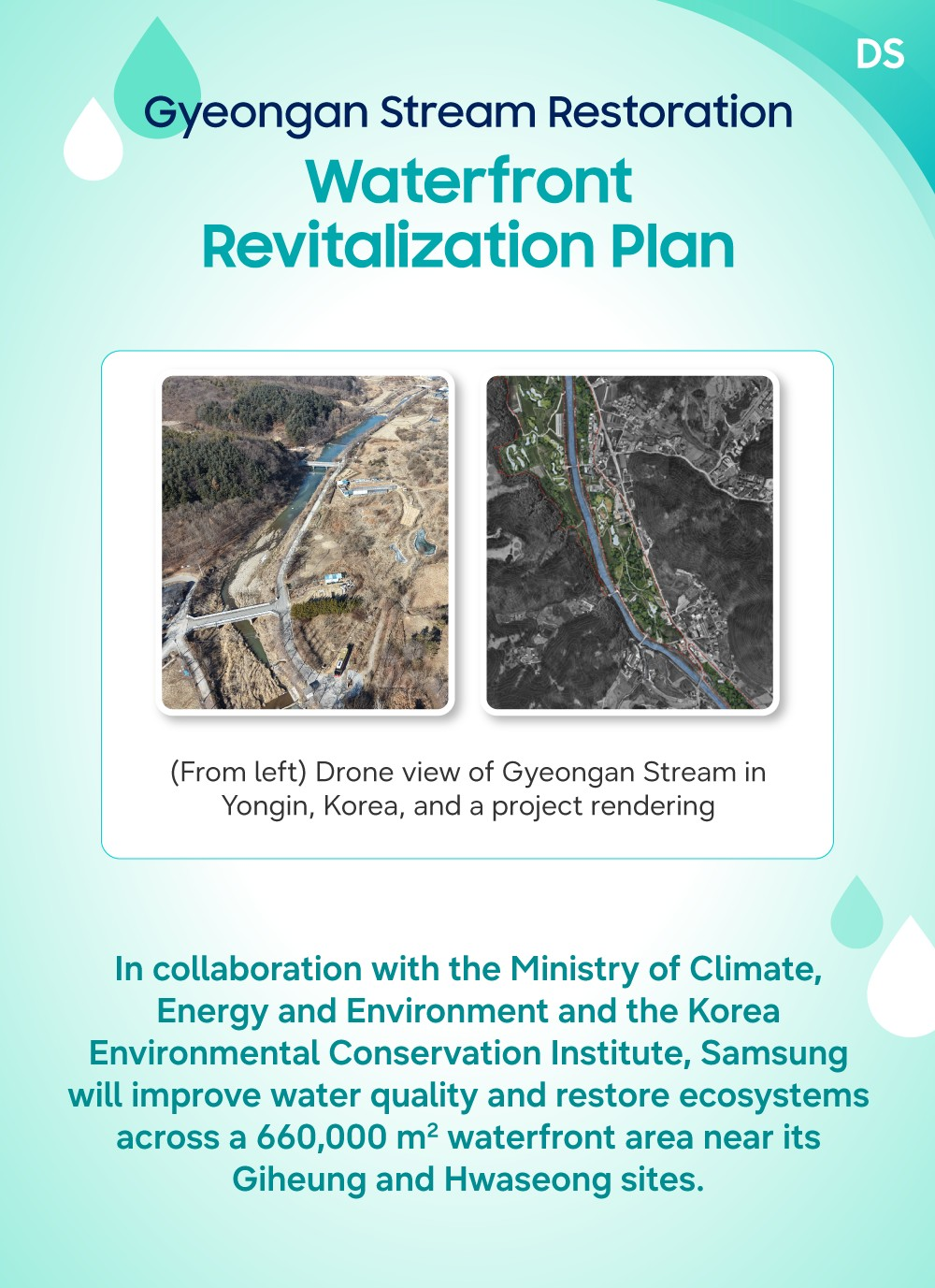 Samsung también señaló que trabaja en la restauración del arroyo Gyeongan junto con el Ministerio de Clima, Energía y Medioambiente y el Korea Environmental Conservation Institute. El proyecto abarcará una franja ribereña de 660.000 m² cerca de sus sitios de Giheung y Hwaseong, con foco en mejora de calidad del agua y recuperación de ecosistemas.