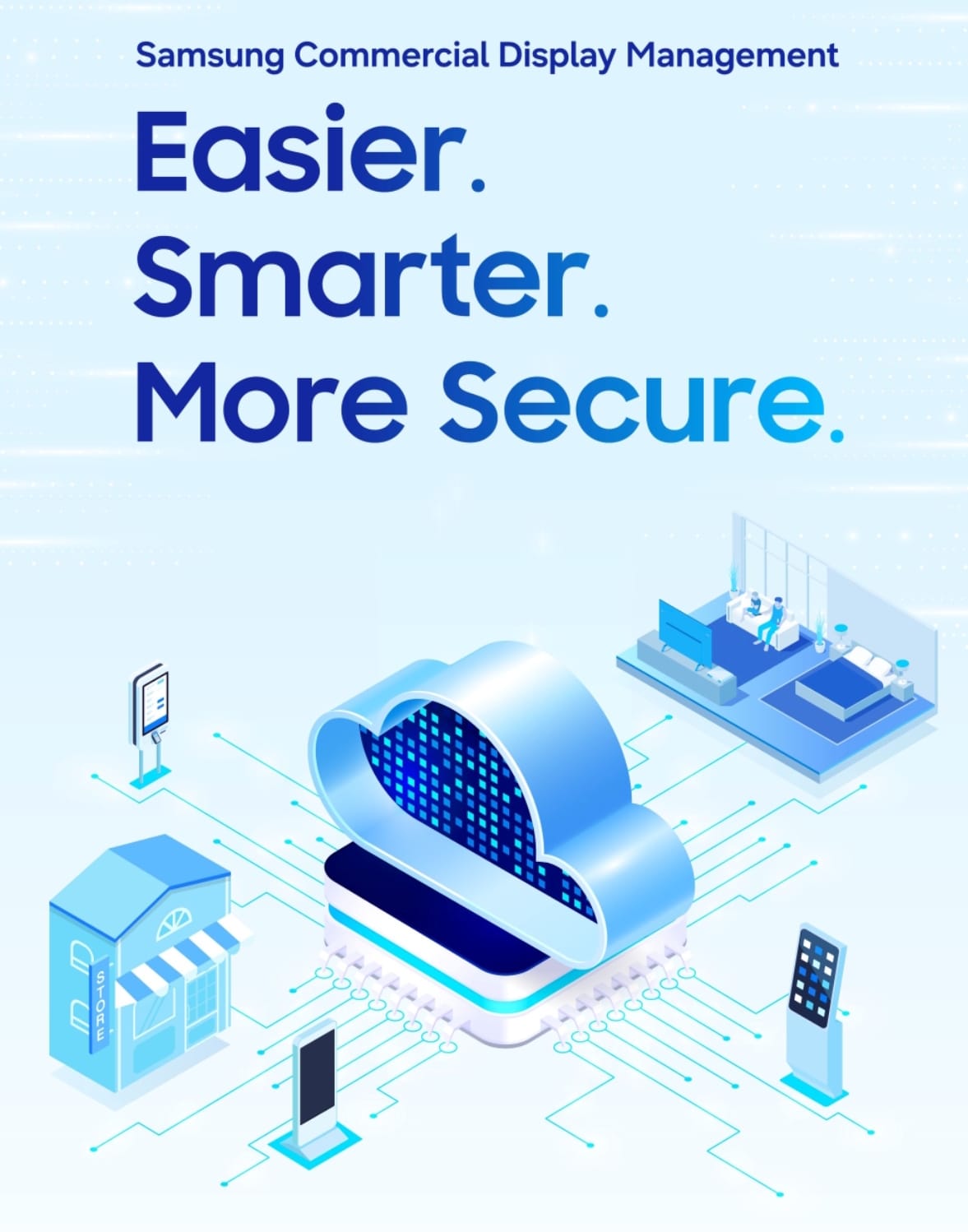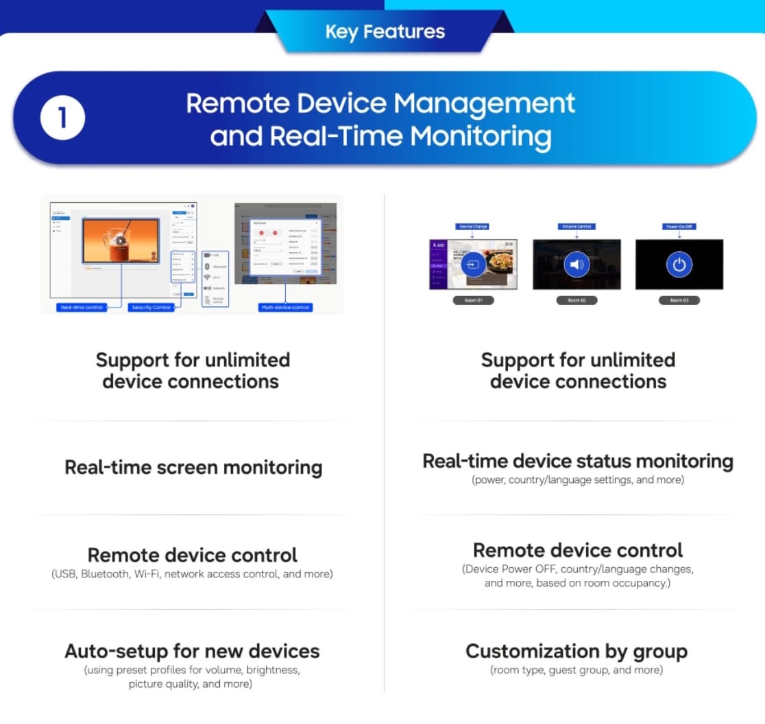 Samsung Commercial Display Management propone un ecosistema más inteligente y seguro para el retail y la hotelería. Estas soluciones basadas en la nube están construidas para simplificar las operaciones comerciales complejas, añadiendo un valor estratégico a cada espacio físico.