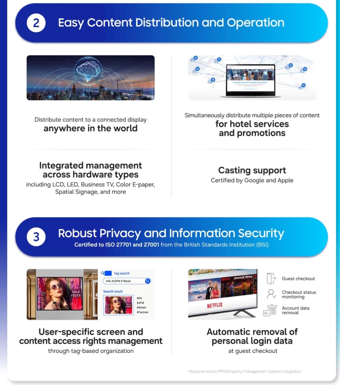 La distribución global de contenidos se integra con diversos tipos de hardware bajo estrictos estándares de privacidad. Con certificaciones ISO 27701 y 27001, Samsung garantiza la protección de datos y la eliminación automática de información personal al finalizar cada sesión.