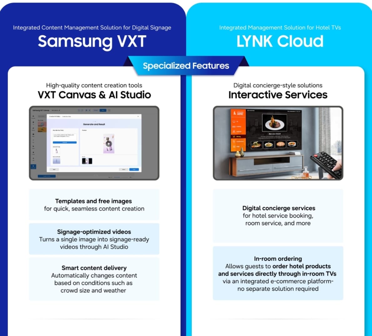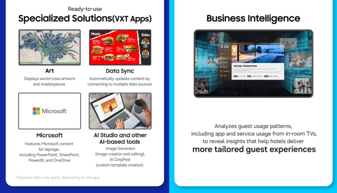 VXT Canvas y AI Studio transforman imágenes estáticas en videos optimizados mediante inteligencia artificial para señalización digital. Simultáneamente, LYNK Cloud ofrece servicios de conserjería digital que permiten realizar pedidos y reservas directamente a través de la interfaz del televisor.