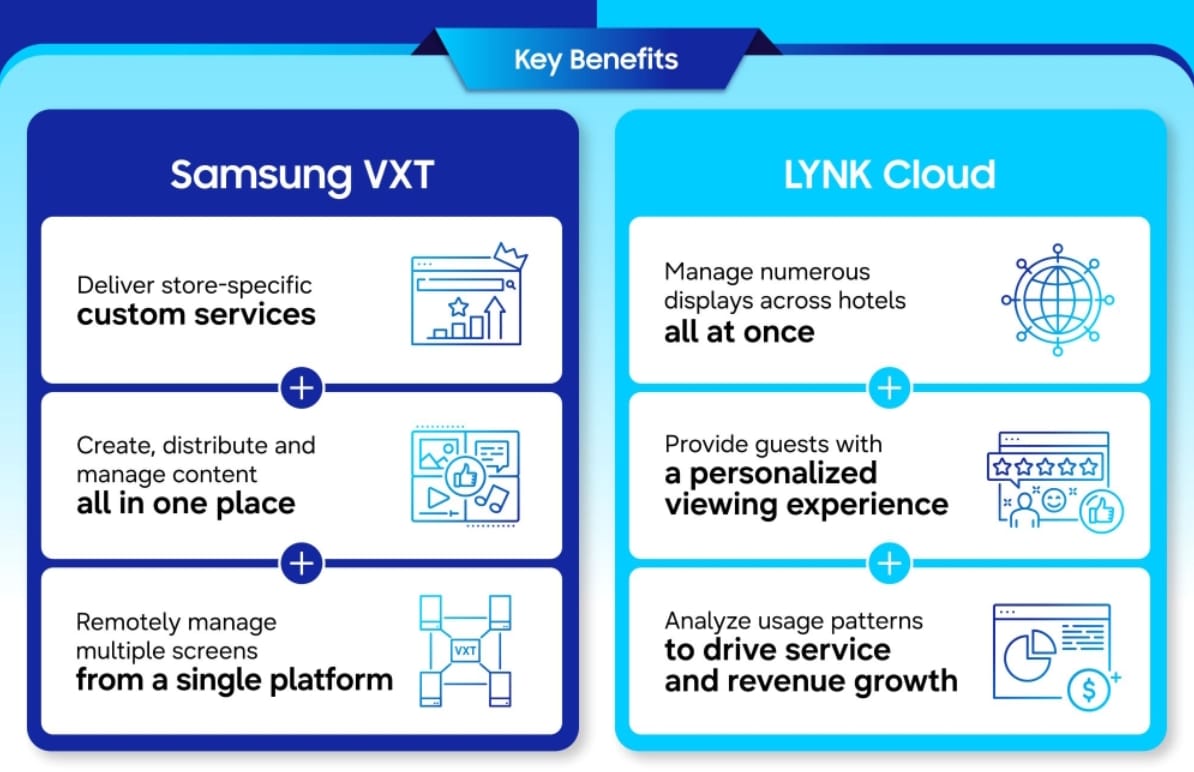 Samsung VXT y LYNK Cloud consolidan la creación, distribución y gestión de contenidos en una plataforma única y remota. Este enfoque integral impulsa el crecimiento de los ingresos mediante la personalización de servicios y el análisis profundo del comportamiento del consumidor.