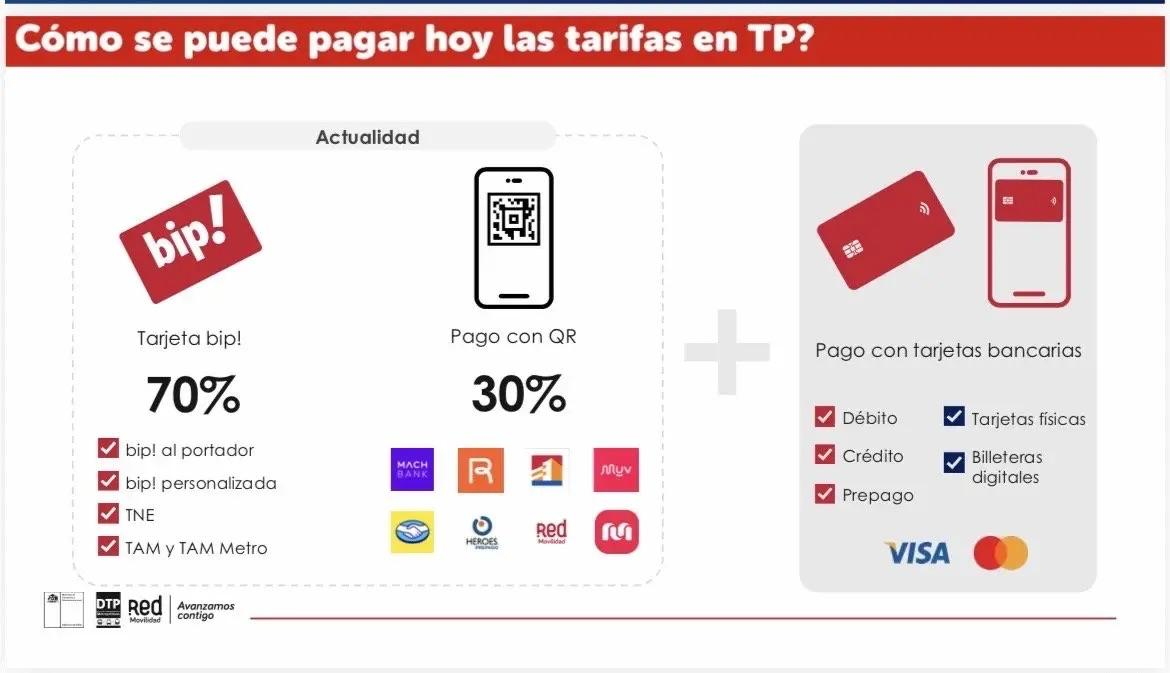 El sistema Red Movilidad romperá la hegemonía de la tarjeta Bip, que actualmente concentra el 70% de las validaciones, permitiendo el uso directo de plásticos de crédito, débito y prepago directamente en los validadores de la red. La arquitectura tecnológica soportará transacciones contactless de las franquicias Visa y Mastercard, así como la tokenización de pagos a través de dispositivos móviles compatibles con billeteras como Google Pay y Apple Pay.