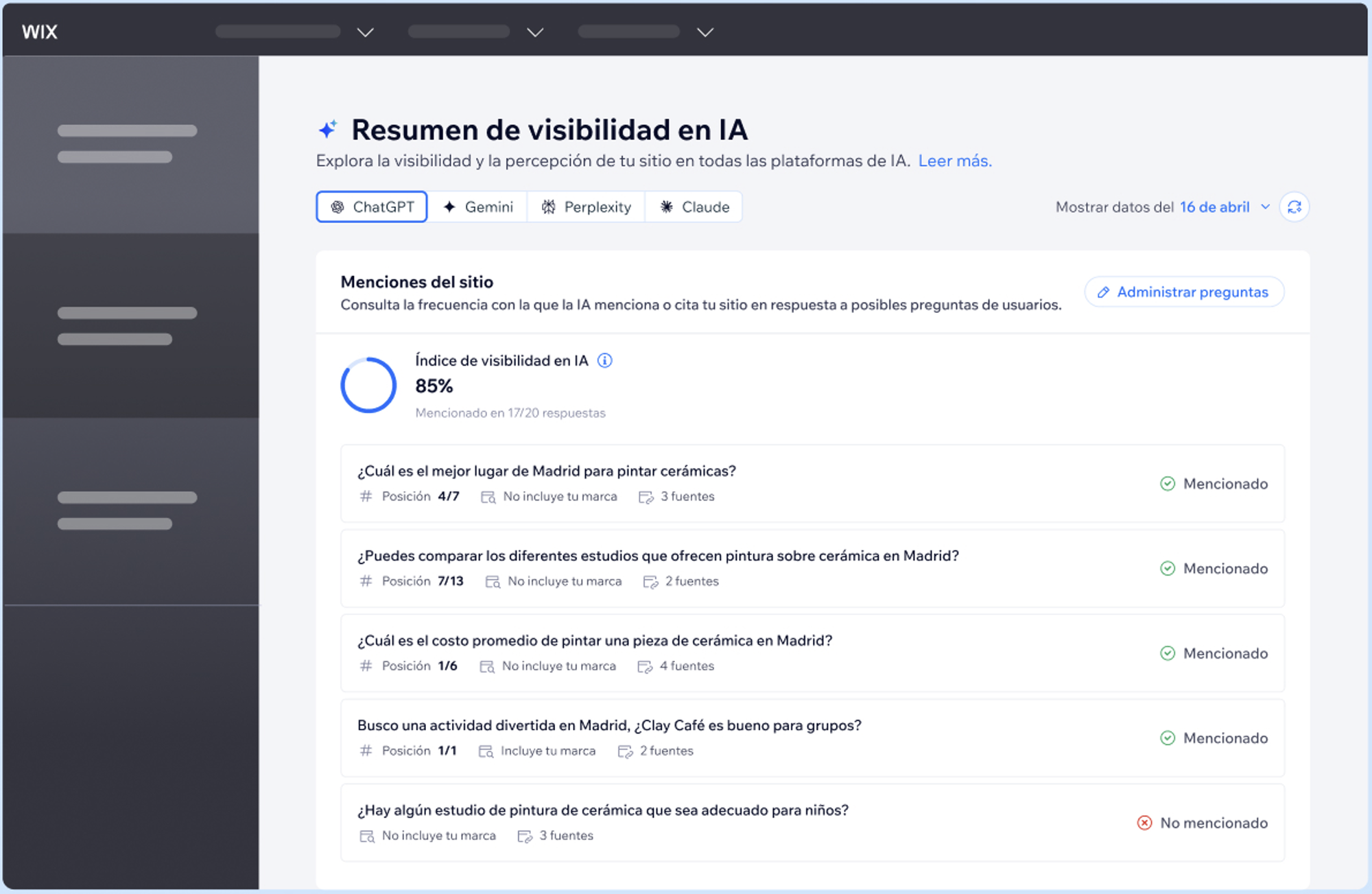 Resumen de visibilidad en IA ya está disponible para los usuarios de Wix en inglés y será implementado progresivamente en otros idiomas.